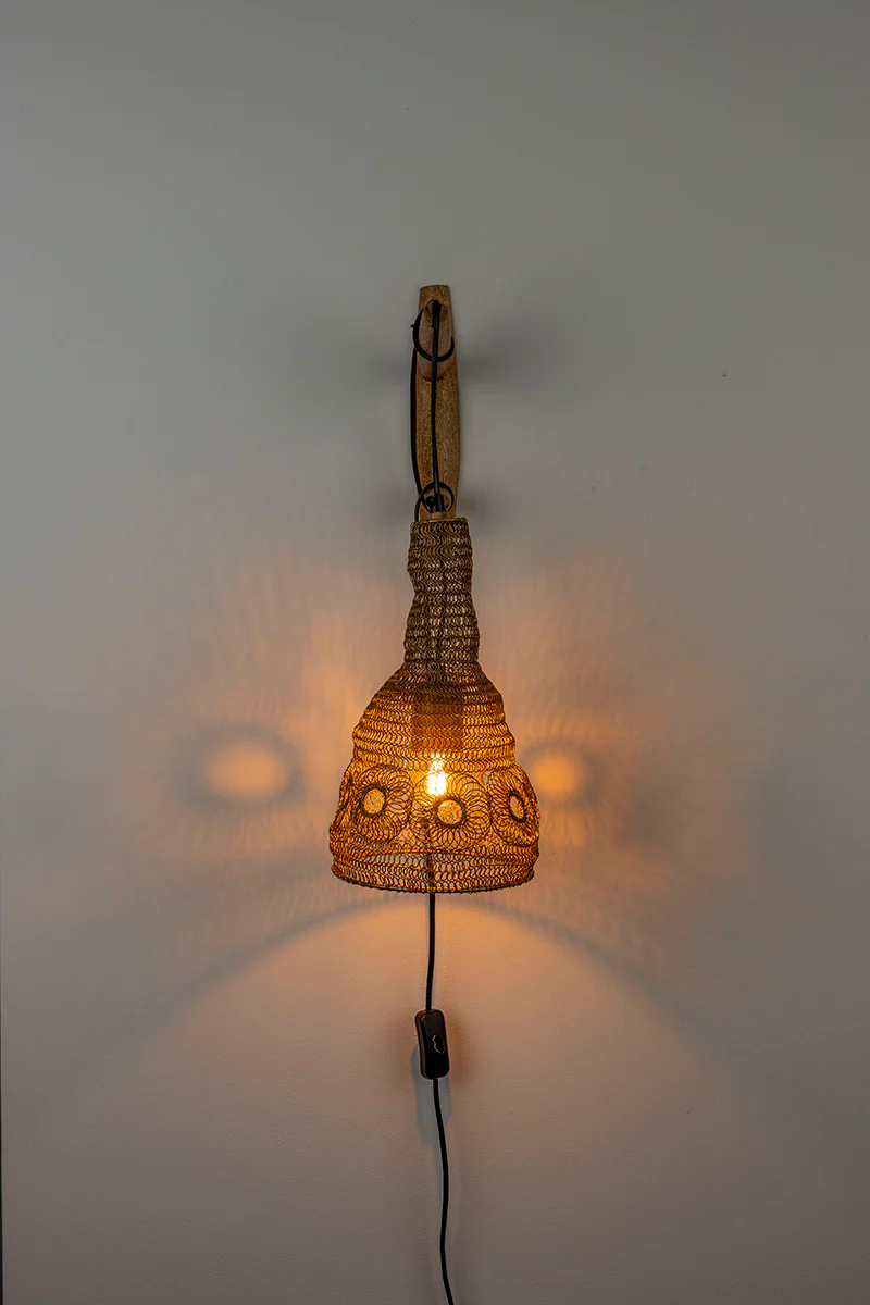 A base to be fixed to the wall, made of mango wood for an exotic earthy touch and a lamp box reminiscent of the macramé technique. But the lampshade is actually made of matt silver lacquered iron mesh in an atypical style.