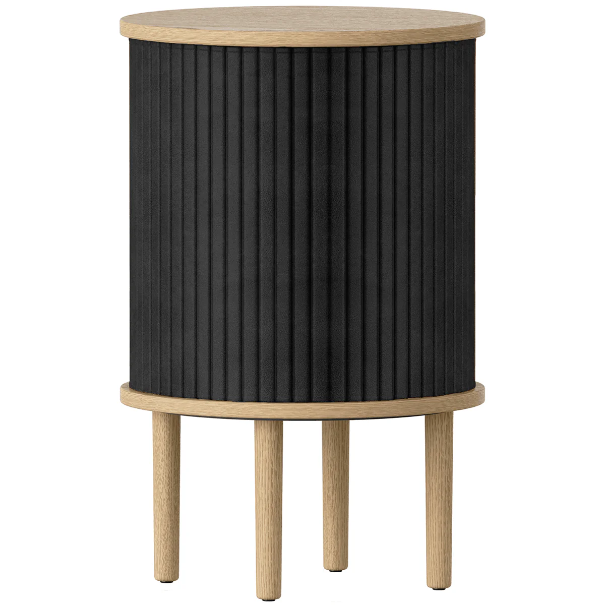 The Audacious side table is available in oak, dark oak and black oak with tambour doors in fabrics and faux leather of different carefully selected colours.