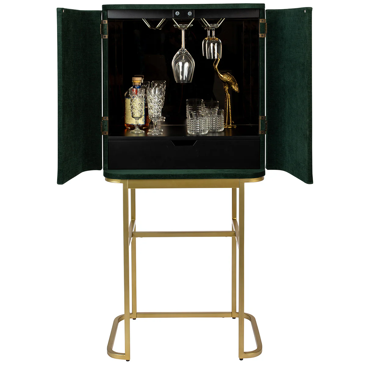 Two doors push open to reveal three rows of wine rack storage, plus a pull-out drawer. A mirrored back panel is the cherry on the Deco cake. In addition to the velvet finish, the Ava Morgana cabinet comes in two other finishes crocodile and snake.