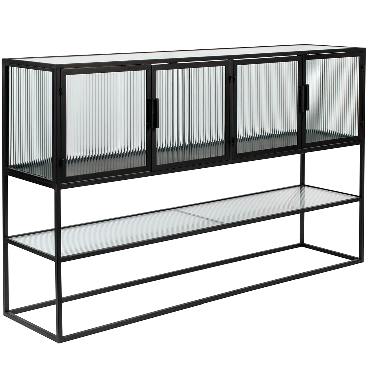 There is a Boli for every room! The cabinets, sideboards, and tables in this extensive series all feature that fabulous ribbed glass. It lets the light through but hides the clutter at the same time. It doesn’t get any better than this. The combination with the dark steel framing gives a pleasant, industrial feel. Sideboard Boli Black High looks airy but has huge storage potential. Not only behind those four doors but also on the shelf underneath and on the surface on top. Easy to combine with different furniture pieces and styles.