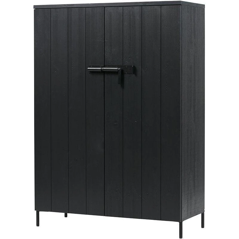 The Bruut 2-doors cabinet from the WOOOD collection is a sturdy storage cabinet and an addition to any room. The cabinet is made of pine wood that has a brushed finish. The legs and the gifted clasp are made of metal. Both the pine wood and the metal is finished in the colour black.