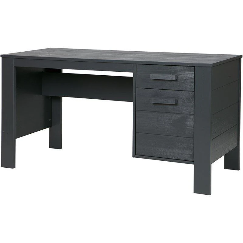 Dennis desk is an in-house production of the Dutch brand WOOOD. The desk has a built-in drawer and a cupboard. The Dennis desk is made of FSC-certified pine, has a brushed finish and is sprayed with waterborne paint in the colour steel grey. This desk is part of Dennis room, this room consists of a sofa bed or a bed without walls, a desk, a closet, a storage box, a bedside table and a wall shelf.