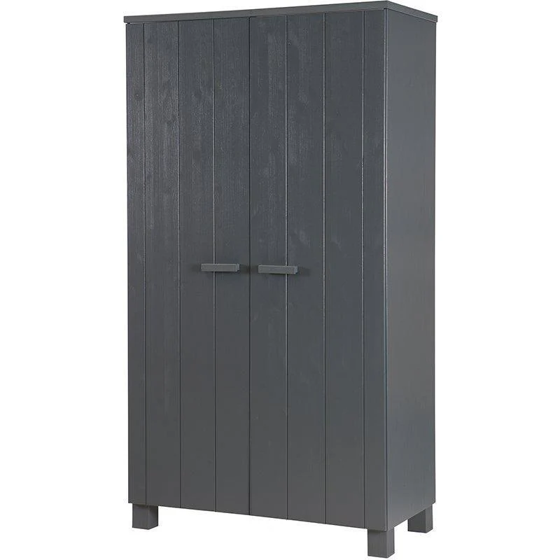 The hanging/laying cabinet Dennis is an own production of the Dutch brand WOOOD. The Dennis cupboard is made of FSC-certified pine, has a brushed finish and is sprayed with water-based paint in the colour grey. The doors have a vertical V-groove line, the interior of the cabinet is made of melamine and consists of one wide shelf at the top and below on the left a split rod and on the right three split shelves. This cabinet is part of the Dennis room, this room consists of a sofa bed or a bed without walls, a desk, a closet, a storage box, a bedside table and a wall shelf.