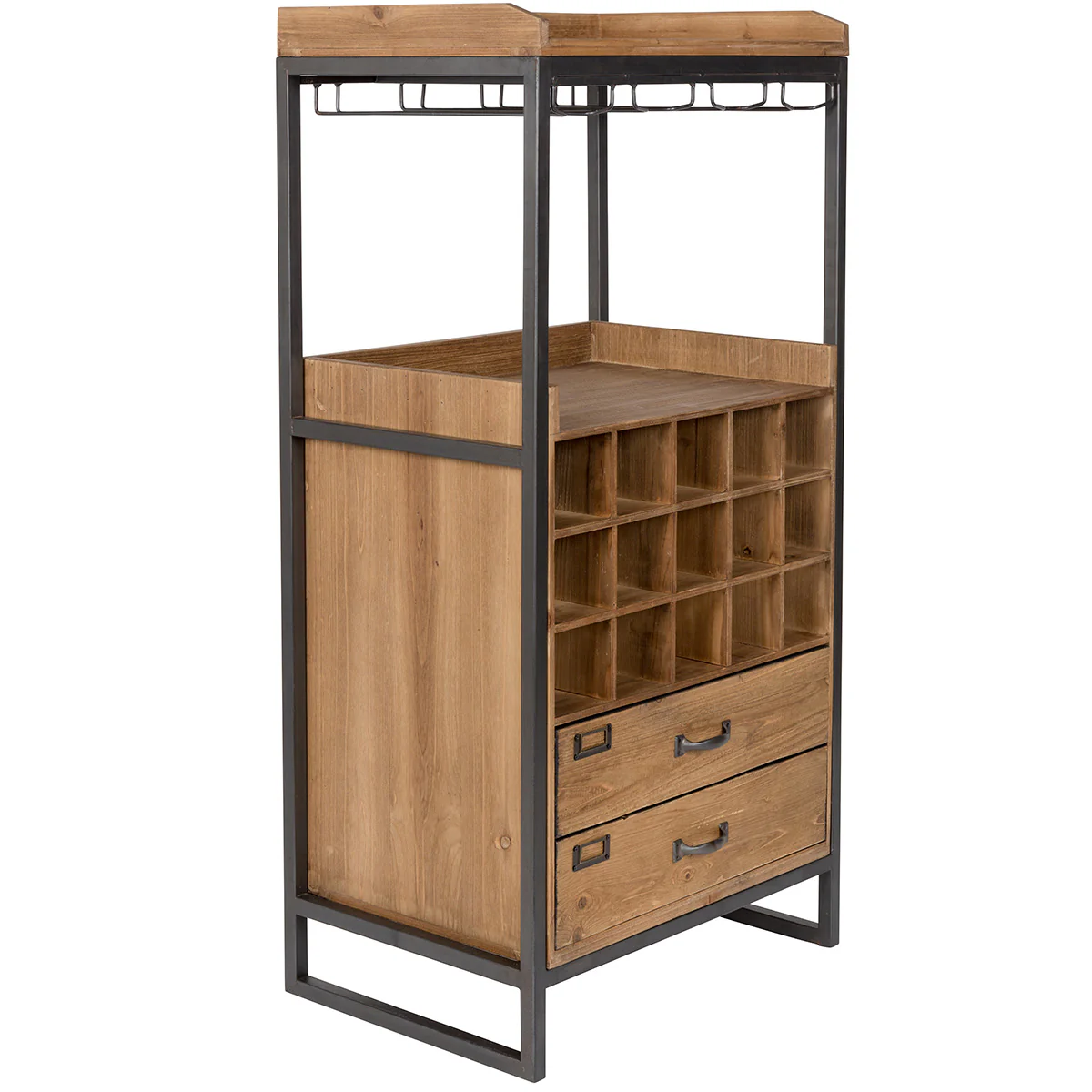 With its authentic and modern design, a mix of fir wood and powder-grey lacquered iron, it is the perfect piece of furniture to store glasses and bottles and have everything at hand.