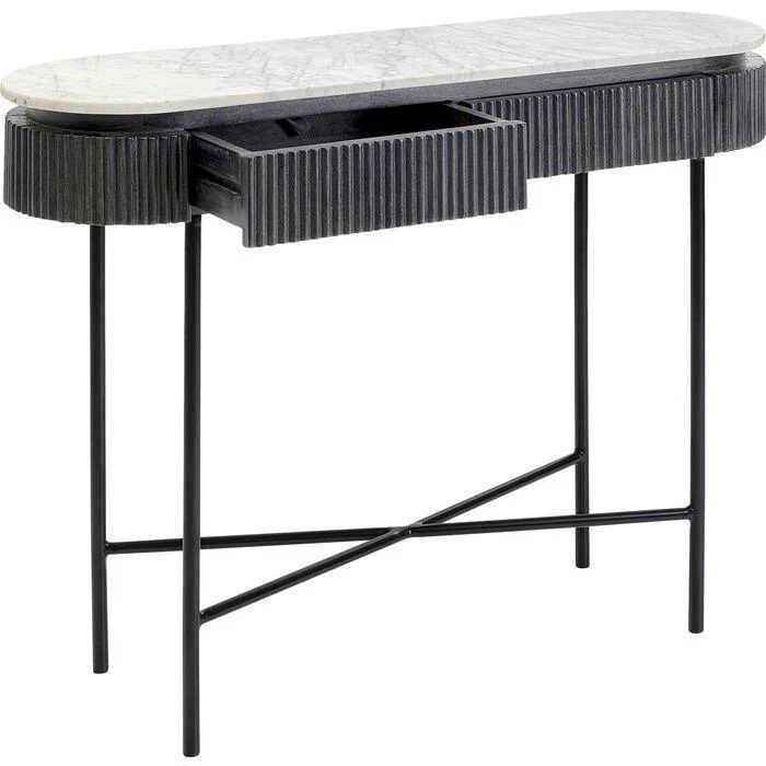 Classy and special - this hallway console table wants more. The form: a flat oval, with a top made of light, genuine marble and a body that stands out among console tables with its dark grey fronts and sides made of solid wood with a ribbed look. Glenn radiates discreet refinement and timeless elegance and makes its mark with valuable materials. Other pieces from Glenn's collection are available.