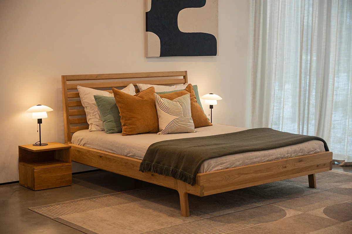 The Kiko bed features a gently inclined, slatted headboard where optional cushions can be attached. Beautiful details and contours make the wooden Kiko bed a unique product.