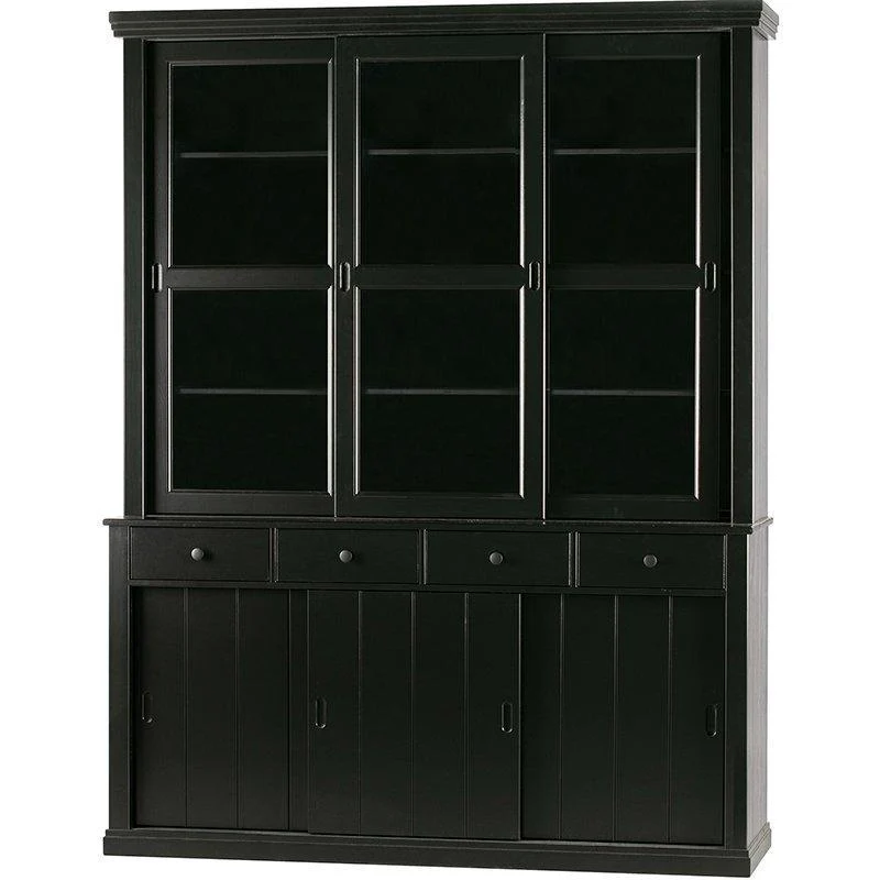 Lagos is a rural, timeless store cupboard from the collection of the Dutch brand WOOOD. The store cupboard is made of solid, FSC certified, pine wood and has a black finish. The back wall is made of MDF and the cabinet is equipped with chipboard shelves. The inside has a black finish. The top sliding doors incorporate safety glass (tempered glass).