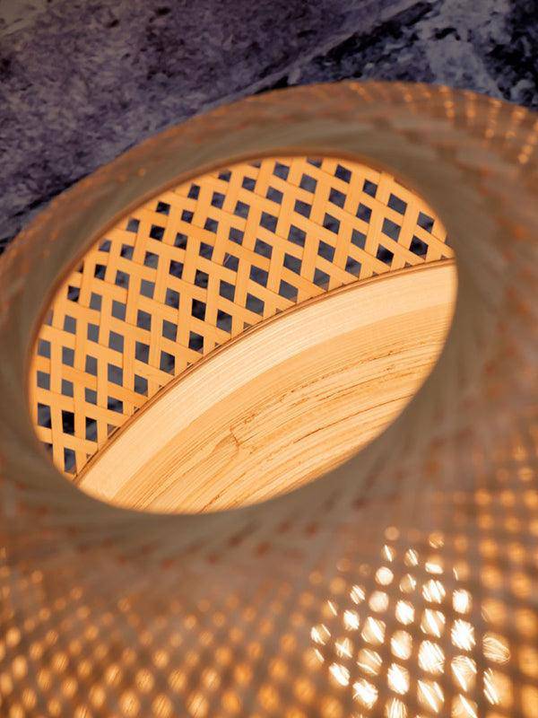 Thanks to its modern yet rustic features, this table lamp is a unique lighting element that creates a homely atmosphere even when turned off. Its round, closed lampshade is made of bamboo. While the upper part is adorned with delicate patterns in a natural color, the lower part is designed entirely in glossy, opaque white. There is a wooden jar on the inside. Thanks to the pattern, the light directed upwards creates an atmospheric light image that creates a cozy feeling.