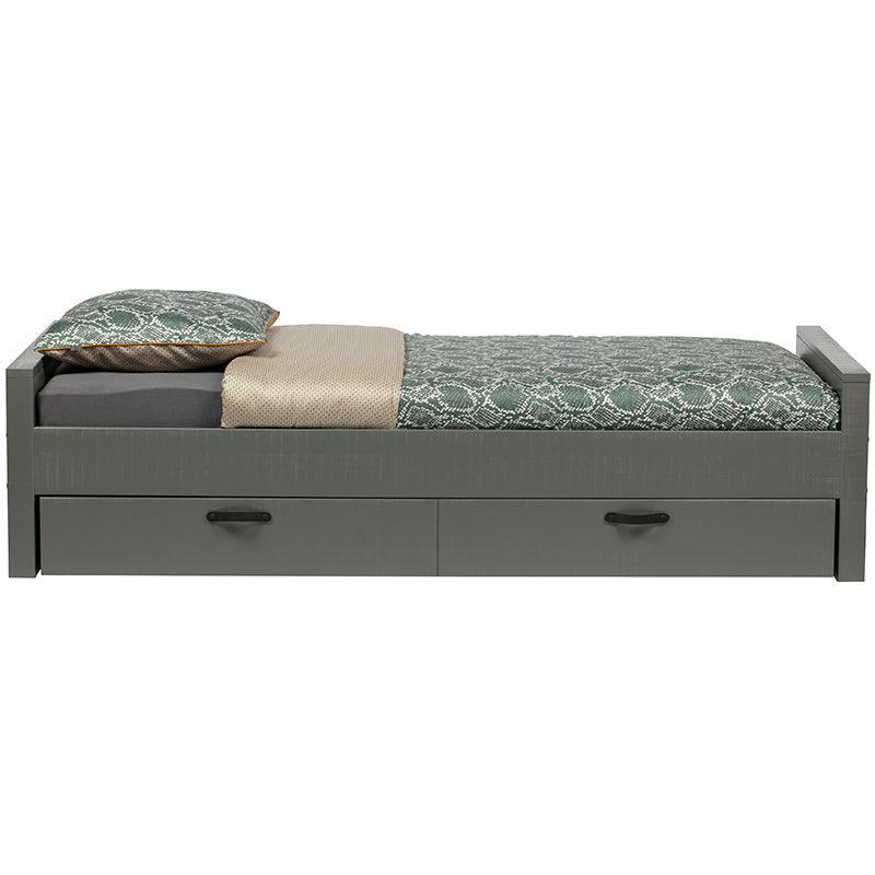 Contemporary and cool, that is the perfect description of this 1-person bed Morris from the collection of the Dutch brand WOOOD. The Morris bed with a handy storage drawer is optionally available. The bed is spray-painted in the cool colour clay and is made of solid pine with a rustic finish. This bed is part of the Morris room, this room consists of this bed, a bed drawer, a desk, a closet and a bedside table.