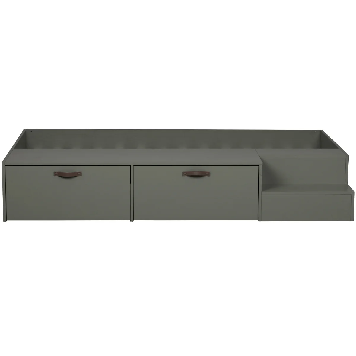 This Stage bed from the collection of the Dutch brand Vtwonen is robust and sturdy. The bed is made of solid, FSC-certified, pine lacquered in a green soap tint. The two extra matching bed drawers with brown leather handles make Stage complete. Extra storage space in a children's room is always a good idea. The storage drawers are fitted with wheels so that they are easy to open and close. Stage Bed is fitted with two storage drawers, handy for placing a night light.