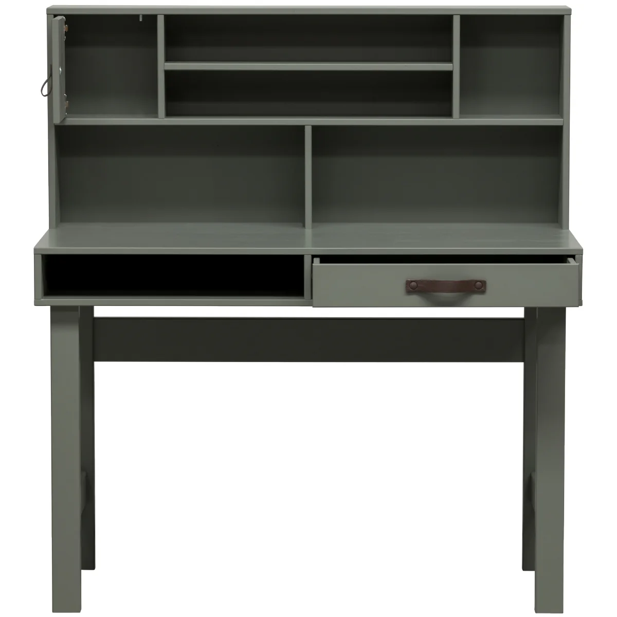 This Stage desk from the collection of the Dutch brand Vtwonen is practical, tough and has a playful look. The desk is made of solid, FSC certified, pine lacquered in a green soap tint and has a back wall with extra storage options. This ensures a tidy and free worktop.