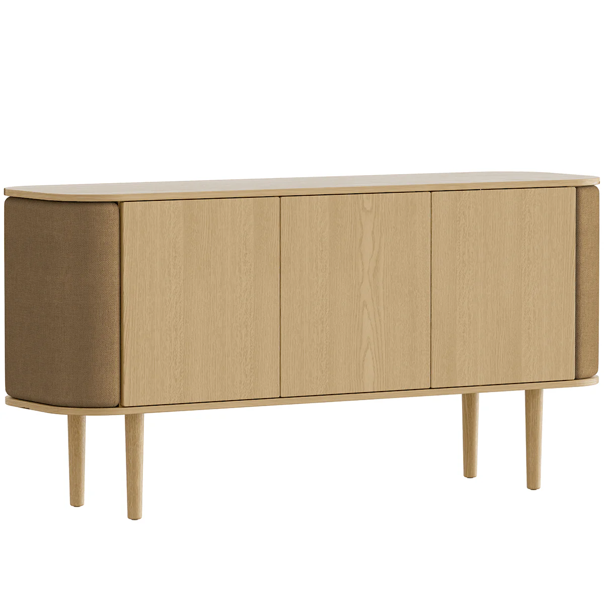 Treasures is a customisable cabinet with a Nordic expression. The cabinet is made from veneered oak wood and the curved sides of the cabinet have a customisable covering that gives Treasures a soft tactile touch.