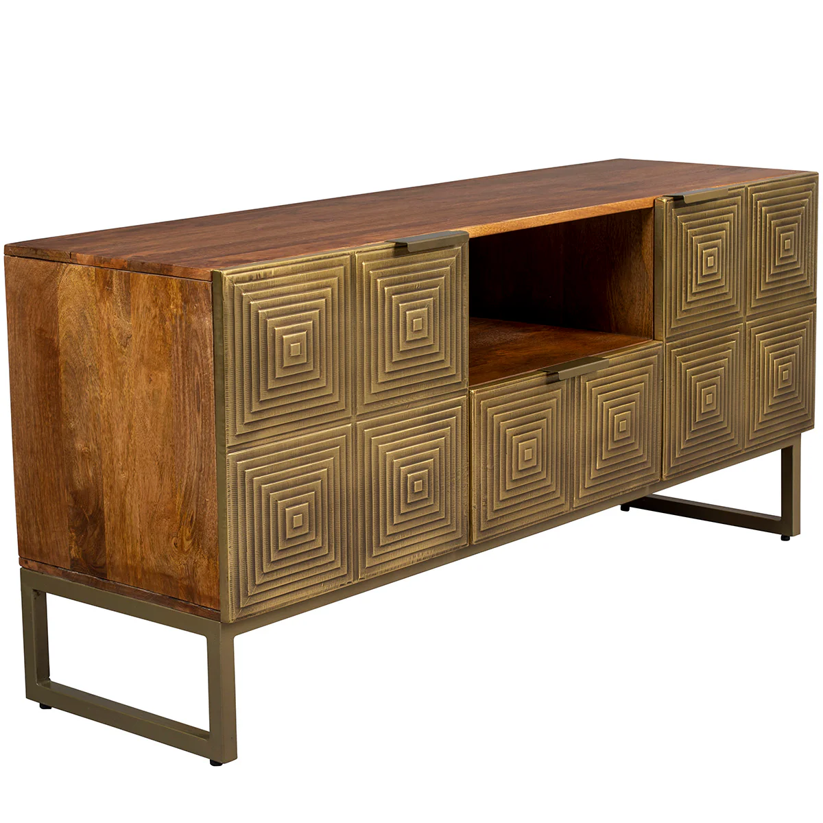 Volan sideboard owes its gorgeous Art Deco look to the work of skilled artisans. The fronts of the doors and drawer of this eye-catching cabinet are covered with thin metal plates that are expertly hammered by hand over the patterns cut into the wood. Volan has an opening at the back to pass cables through, making it ideal for use as TV bench or media console when needed.